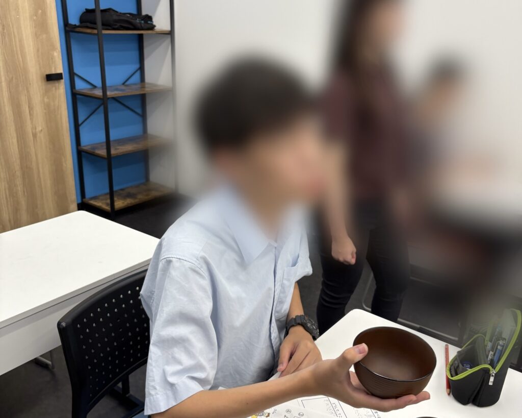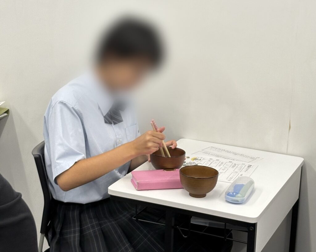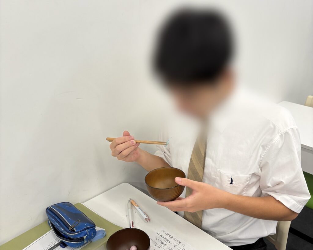 お椀の持ち方とお箸の持ち方を職員からレクチャー!
