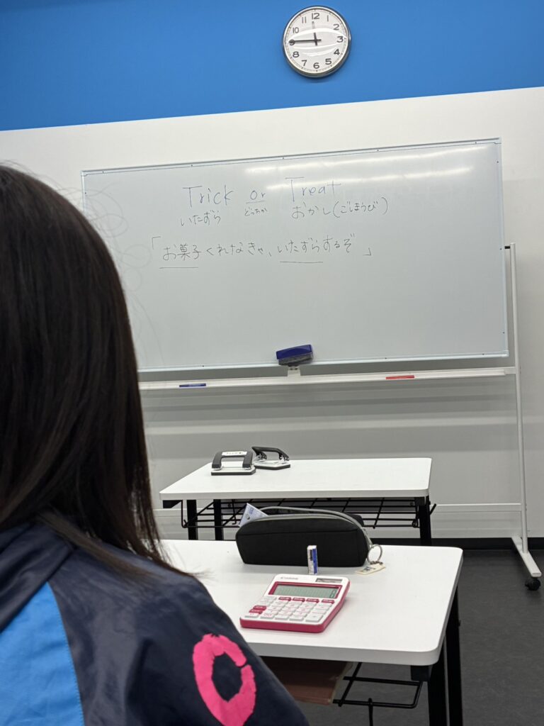 ちなみに学生の中には、意味を知らずに使っている人もいたので、授業の空いた時間に、「トリックオアトリート」の意味を勉強しました📚