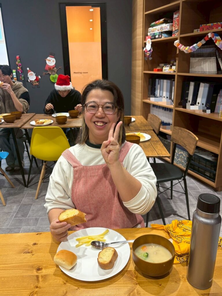 ごはん担当の学生たちが作ってくれたシチューとパンを堪能😋