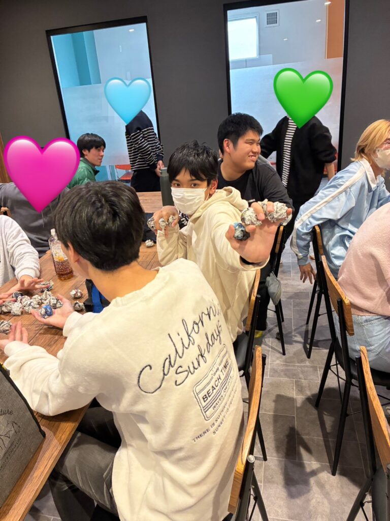 キンパを食べた後は、皆で豆(の代わり)を手に装備!